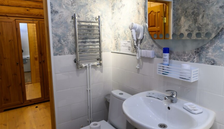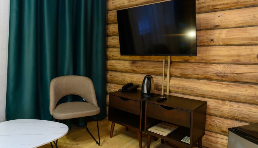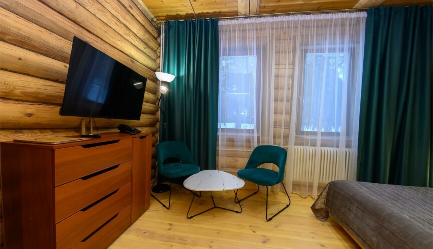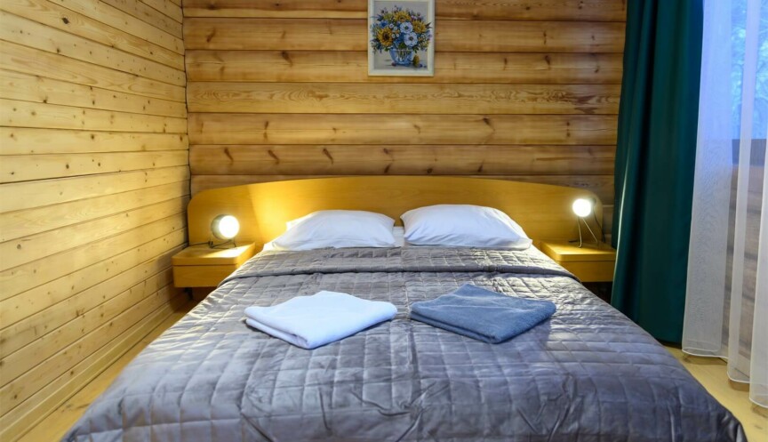 Однокомнатный номер с большой двуспальной кроватью подойдет для размещения двух или трех человек, с учетом дополнительного места. Комфортабельное размещение, уютная обстановка и древесный запах оставят незабываемые впечатления и подарят атмосферу единения с природой.