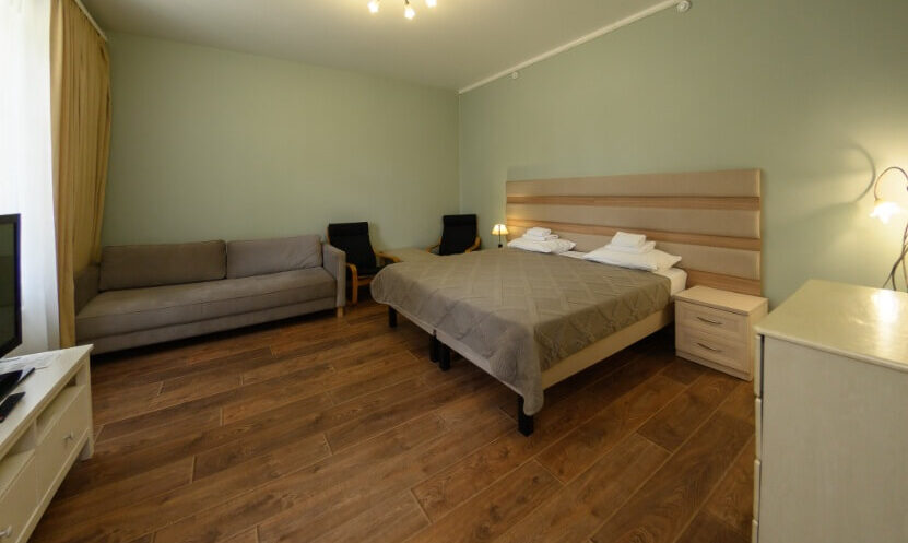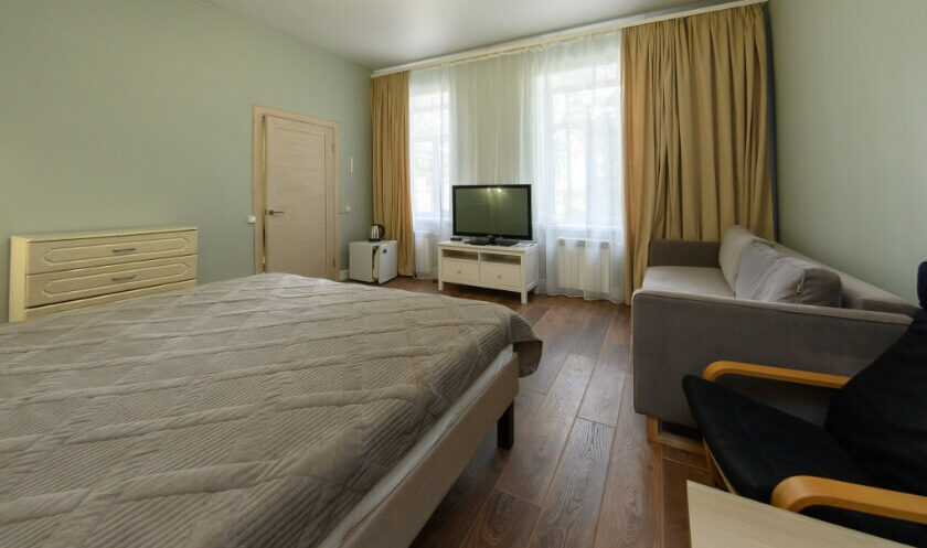 Комфорт в отеле ВКС-Кантри — однокомнатный номер с одной двуспальной кроватью. При бронировании доп мест, размещение на еврораскладушке.